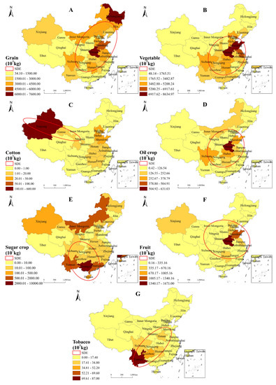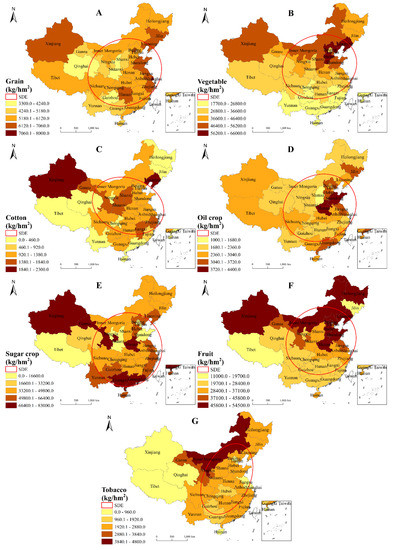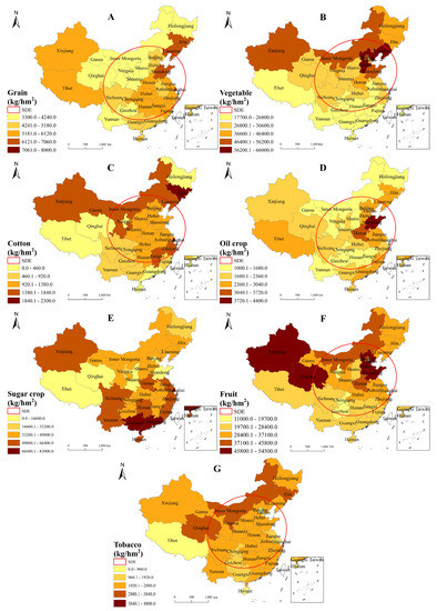 Figure 8 and Figure 9 represent the output on per unit area of arable land in 2008 and 2018, respectively. The subfigures A-G illustrate the output of grain, vegetable, cotton, oil crop, sugar crop, fruit and tobacco on per unit area, respectively. Interestingly, the spatial distribution of output per unit area and total output in each province are inconsistent. Taking grain as an example, although the grain yield of most major producing areas was higher than that of nonmajor grain producing areas (the former was 5464.21 kg/hm2, while the latter was 4720.75 kg/hm2), there are contrasting examples. The total grain yield of Heilongjiang in the main grain-producing areas ranked 1st in the country, but its grain yield per unit was low (rank 24th in 2018). Conversely, the total grain outputs of Tibet, Guangdong, Fujian, and Zhejiang (members of nonmajor grain-producing areas) are low, yet their grain yields per unit area are relatively high. The distribution patterns of vegetables and fruits were similar: the high-value regions were concentrated in northern China. Even so, the yield per unit area of fruit still gradually formed a new high-value region in northeast China by 2018.
