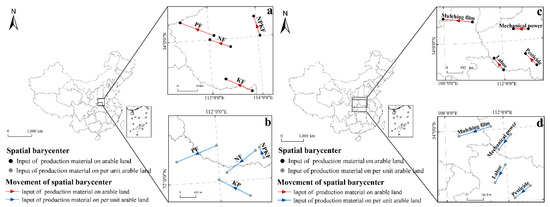The movement of the spatial barycenter for the input on arable land is shown in Figure 10, in which subfigure a and c illustrate the movement of barycenters of different kinds of inputs, while b and d illustrate the movement of barycenters of different inputs on per unit area. The spatial barycenters of all kinds of inputs were located in the central region of China (Henan, Hubei, and Shaanxi) and moved towards the west, which showed obvious consistency. In terms of the total amount of input (the red arrows in Figure 10), the spatial barycenter migrated towards the northwest. However, in terms of the input per unit area (the blue arrows in Figure 10), except for potash fertilizer and compound fertilizer, the spatial barycenter of all inputs moved towards the southwest.