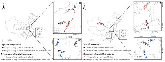 The movement of the spatial barycenter for the outputs on arable land is shown in Figure 11, in which subfigure a and c illustrate the movement of barycenters of different kinds of outputs, while b and d illustrate the movement of barycenters of different outputs on per unit area. From the perspective of total output (the red arrow in Figure 11), the barycenter of grain moved towards the northeast, cotton and sugar crops moved towards the northwest, and the other crops all moved towards the southwest. In terms of yield per unit area (the blue arrow in Figure 11), only the fruits, vegetables, and sugar crops moved in the same direction as their total yield. The barycenter of both total output and yield per unit area of fruits and vegetables moved towards the southwest. Conversely, the barycenter of both total output and yield per unit area of sugar crops shifted towards the northwest.