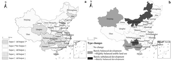 In those provinces with the lowest D_CCIO, the lack of arable land resources is the main limitation, as megacities in China, Shanghai, Beijing and Tianjin had low arable land areas (lower than 4.37 × 105 hm2), which ranked last, second last and third last among the studied provinces (Table 3). Located in the western high-altitude zone, Tibet and Qinghai lack ideal water and heat resources and maintain low cultivated land area (<5.91 × 105 hm2), which ranks 4th and 5th from the bottom, respectively. Hainan Province is also limited by the amount of arable land resources (<7.22 × 105 hm2), which ranked 6th from the bottom. Located on the Loess Plateau, Ningxia faces the challenge of the natural environment caused by water resource shortages and soil erosion (cultivated land area <12.9 × 105 hm2, the 7th from the bottom). These regions all showed a characteristic of a large change in input and a small change in output. Surprisingly, this study found that two major national agricultural regions showed significantly weaker land use: Jilin and Liaoning Provinces (marked with × in Table 3). As an important agricultural region in northeastern China, Jilin and Liaoning enjoyed a deal area of arable land (the former 4.972 × 106 hm2, ranked 5th, the latter 6.987 × 106 hm2, ranked 13th), whereas they showed lower D_CCIO and a less ideal change trend (input increase but output decrease in Jilin, output growth slower than the growth of input in Liaoning). The “output lags behind input” phenomenon in important agricultural production provinces may go against the overall arable land use efficiency.
