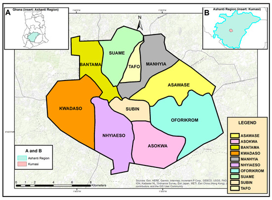 Kumasi has its centre coordinated as latitude 6°42′00.0″ N, longitude 1°37′12.0″ W and it is about 270 km north of the capital of Ghana [17]. The city started with a concentric form and spread outwards from areas like Adum, Bompata and Krobo. Kumasi receives an annual mean rainfall of 1484 mm and has a bimodal rainfall distribution. The Kumasi Metropolitan Assembly (KMA) lies in the transitional forest zone and its major form of cultivation is urban agriculture [17]. The study area covered 10 sub-metropolitan areas with an approximate area of 194.38 square kilometers defined as the Kumasi Metropolis (Figure 1).