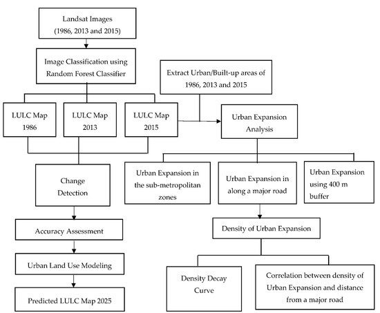 Remote Sensing imaging (ground, aerial and satellite) has been utilized to obtain land classification maps for monitoring and analyzing LULC changes [22,23]. Satellite imagery has contributed to studies on the spatial analysis of urban/built-up areas. These satellites include Landsat Thematic Mapper (TM) and Operational Land Imager (OLI) [24,25,26,27]. Multi-temporal and multi-spectral spatial datasets have proven to be economical and efficient tools for quantifying, monitoring and predicting future land cover change [28,29]. Seminal literature has assessed LULC changes in Kumasi focusing on lost agricultural lands, the extent of LULC and deforestation [20,30,31] and other works have concentrated on the modeling of land use prediction in different cities in Ghana [30,31].