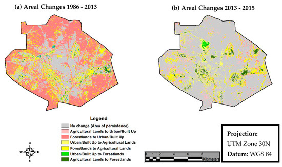 For the areal changes between 2013 and 2015, the visual inspection indicated traceable changes. The urban/built-up areas were persistent. The most prominent changes were obtained between forestlands and agricultural lands (Figure 4).