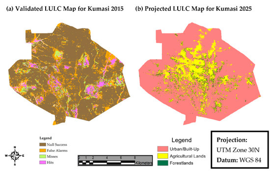 Figure 5a depicts the validated projection of the LULC map for 2015 illustrating the accuracy accomplished by the model. The maps were composed of ‘null success’, ‘false alarms’, ‘misses’ and ‘hits’. The visualization revealed that ‘null success’ dominated. However, false alarms were seen widely in the validated map.