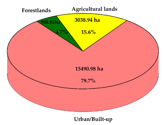 The annual rate of change recorded high percentages for agricultural lands and urban/built-up areas. However, forestlands diminished the most, reducing consistently during the entire period. This indicated that urban/built-up areas were increasing to the detriment of the other LULC types (Table 4).