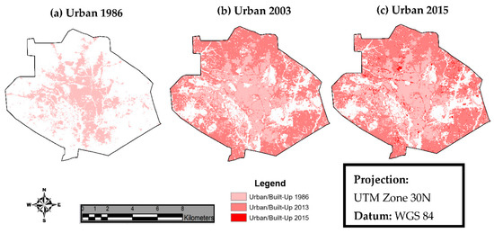 In the classified image of 1986, the central portions of the city were the urban/built-up areas; however, most of the area was covered by forestlands. The urban/built-up areas were surrounded by portions of agricultural lands. However, in the classified image of 2013, most portions located in the peripheries of Kumasi were covered by urban/built-up areas. Visually, the forestlands had decreased the most. The 2015 classified image had almost all the boundaries transformed into urban/built-up areas. Nevertheless, it had small clusters of forestlands within the metropolis.