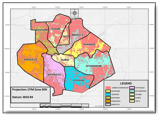 Previous works in Kumasi focused on LULC changes [39], the depletion of urban greenery [40,41]; deforestation and agricultural lands [20,42]; peri-urban trends in Kumasi [43,44]; urbanization and climate [36,45]; and urbanization, land utilization and spatio-environmental impacts [46]. In our research, we focus on the urban/built-up areas of Kumasi. Deeper insights into the urbanization process utilizing different urban analysis techniques were executed at the sub-metropolitan level. We attempt to model and predict a future LULC map for 2025 to serve management purposes for future decision making. Hence, we hypothesize that urban/built-up areas are increasing at the expense of the other LULC classes in Kumasi within the study period.
