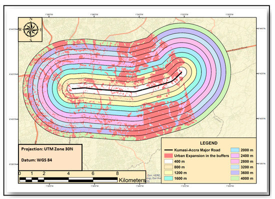 The urban expansion maps were converted from raster format into a vector form and were overlaid with the Kumasi–Accra road. Within a 4 km buffer, a 400 m buffer interval was used. This research utilized the 400 m interval buffer based on previous literature [56] and was also adopted as a pragmatic approach. The buffers were commutatively created around the Kumasi–Accra road. Each of the buffers invented was overlaid with the urban expansion feature to compute total urban expansion present in each buffer. These map conversions and buffer creation operations were executed using the ArcGIS 10.7.1 software.