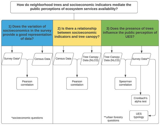 To answer the first two questions, we performed the Pearson correlation test between the socioeconomic survey questions and Census data and between tree canopy data and Census data, as the variables were parametric. To answer the third question, we performed the Spearman correlation test between the tree canopy data and the survey urban forestry questions, as the variables were nonparametric. For both Pearson and Spearman correlation we considered the results that were significant with p < 0.05. For the urban forestry questions in the survey that used a Likert scale (Table 1), we performed Cronbach’s alpha, which is a reliability test for the internal consistency of scaled questions and their variance. All statistical tests were performed with SPSS software v.26. Using the open-ended responses, we created a UES typology table (Table 2), which also served as additional data for evaluating and corroborating the statistical analysis.