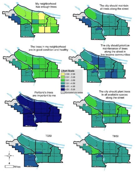 In the questions associated with TOSI and TMSI, most of the answers per zip code were higher than 3 on the Likert scale, except for satisfaction with neighborhood trees. The eastern zip codes had lower satisfaction with the number of trees than the western zip codes. In the question about tree health, the western zip codes had a higher rate on the Likert scale. A zip code in NW, a high-income and high canopy part of the study area, scored the lowest value for trees’ importance.