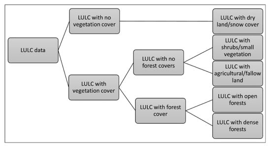 - Hansen, M.C.; DeFries, R.S.; Townshend, J.R.; Sohlberg, R. Global land cover classification at 1 km spatial resolution using a classification tree approach. Int. J. Remote Sens. 2000, 21, 1331–1364. [Google Scholar] [CrossRef]