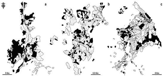 Figure 2. Enclosed fields that have disappeared (in black) between 1956 and 2019 in the three study cases: (a). Somosierra; (b). Arroyo del Valle—Bustarviejo; (c). Rascafría. Own elaboration.