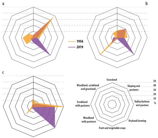 The differences between each of the nuclei analysed were assessed (Figure 3) and none of the nuclei responded identically to the changes, although there was a common parameter in all three, the disappearance of dryland farming. From this common node, each case underwent different modifications in terms of land use. While Somosierra maintained sloping wet pastures and increased its scrubland with pastures and woodlands, Bustarviejo expanded its woodland with pastures and Rascafría increased both the valley bottom wet pastures and woodland with pastures. Up to 53 types of changes in land use were identified between 1956 and 2019 (Table 3). The changes in land use of enclosed parcels between the two dates that exceed 20 ha were mainly from dryland farming to wasteland (scrub and woody areas) in Somosierra (99.85 ha), and from sloping wet pastures to scrubland (10.59 ha) or to wasteland (35.27 ha). In Bustarviejo, the most common changes were from sloping wet pastures to woodland with pastures (43.41 ha), and from dryland farming to sloping wet pastures (40.48 ha), grasslands (22.61 ha), woodland with pastures (25.09 ha), and valley bottom wet pastures (40.13 ha). Finally, in Rascafría, the most common changes were from valley bottom wet pastures to woodland with pastures (40.80 ha) or to urban land (49.03 ha), from dryland farming to grasslands (96.53 ha), sloping wet pastures (21.99 ha), valley bottom wet pastures (174.81 ha), woodland with pastures (98.26 ha) and to wasteland (scrub and woody areas) (291.29 ha), and from fruit and vegetable crops to urban land (12.35 ha).