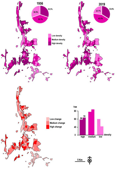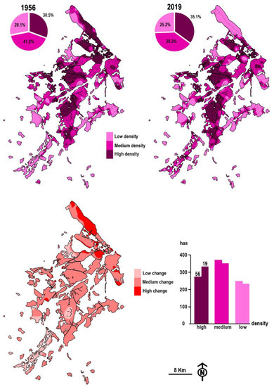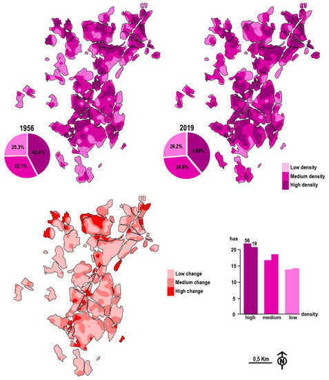 Prior to this process, the polygonal information was converted to linear data, in each case resulting in an area with sufficient line density and with an optimal spatial distribution. Two calculations were performed for the three cases: one in which differentiated values were obtained for 1956 and 2019; and another one in which the differences between the two values was obtained, and the variation between the two years is reflected in a common mask of 2019. Hectares were used as the reference measurement in the calculations, and km2 as the units for output data (raster format and 0.5 m resolution). Finally, the density values and those of change were determined at three intervals obtained from the automatic classification (low, medium, and high), as estimated by the calculation algorithm.