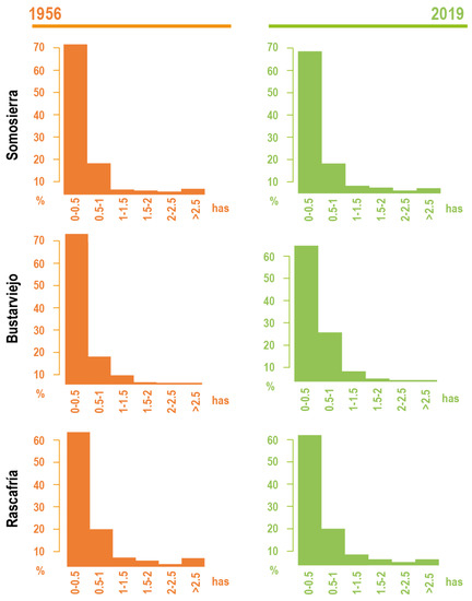 From the point of view of the size of the parcels of land (Figure 8), the three study cases were characterized by having a very small mean parcel size, ranging between 0.1 and 1 ha. Regarding the changes to these land parcels, it was noteworthy that the distribution of the different types did not change substantially between 1956 and 2019, with very similar proportions maintained at the two dates. A detailed analysis revealed that two of the three nuclei experienced a reduction in the smaller land parcels, mainly in those of the 0–0.5 ha size, a 3.7% difference in Somosierra and 9.42% in Bustarviejo) while Rascafría showed almost no variations between the two dates (maximum variation of 0.8% in the 1.5–2 ha size type). A total of 1209 land parcels of the two types disappeared over the study period (321 in Somosierra, 380 in Bustarviejo and 508 in Rascafría).