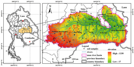 The Mun River Basin is in the northeast Thailand and occupies a large part of the Nakhon Ratchasima Plateau. It is one of Thailand’s major grain-producing areas, but the average yield is low. This area is divided into dry season and rainy season because of the tropical monsoon climate [21], and rice is grown on most farmland during the rainy season, but the farmland is unused in dry season [22]. The soil-quality research in tropical regions is significantly less than in other climate regions, let alone the area with obvious tropical monsoon climate such as the Mun River Basin, and there has been no research on soil quality in the dry season in the Mun River Basin until now. Thus, it is necessary to carry out relevant research in this area, which will not only provide scientific reference for identifying tropical soil characteristics, but also provide practical basis for regional land improvement and agricultural development.