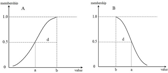 where 0 < ≤ 1, represents the fuzzy membership of indicator ; is the specific value of and is the transition width of , while the is always set to be the difference of indicator values when the membership is 0.5 and 1 [14,33], and is the indicator value when the membership is 1 (Figure 2).