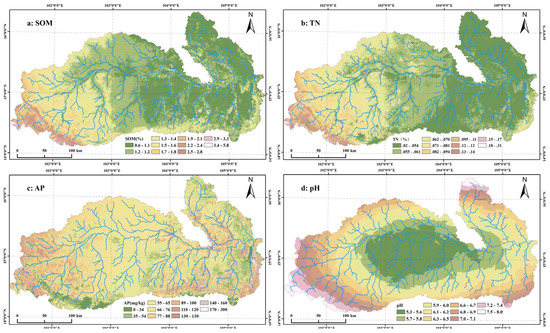According to the MDS model process, this research had screened out four indicators for soil-quality assessment, including TN, AP, SOM, and soil pH, while the seven auxiliary indicators including elevation, terrain curvature, topographic index, distance to rivers, NDVI, EVI, and MSAVI that were preselected for GWR construction were not all used as the multicollinearity among other variables exceeded the tolerance of the model. Moreover, there were no auxiliary indicators selected for the interpolation of pH, and the kriging method was used to obtain the spatial distribution of pH.