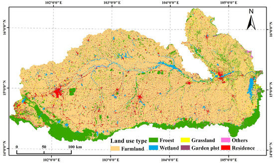 The Mun River Basin is in northeast Thailand and includes 10 provinces. The Mun River is a tributary of the Mekong River, and the basin is approximately in the range of 14°07′–16°23′ N and 101°16′–105°38′ E with an area of 70,435.94 km2. The terrain generally shows a trend of higher west and lower east with the elevation in the range of 17–1300 m, and the mountains are mainly distributed on the southern boundary of the basin (Figure 1). It has a tropical monsoon climate, and the dry season is from mid-October to the end of April of the next year with a lower precipitation than rainy season. The soil texture types of the basin mainly include light clay, loam, sandy clay loam, and sandy loam, the proportions are about 18.70%, 17.97%, 10.90% and 52.44% respectively, and sandy loam is the main soil. Approximately 78% of the study area is farmland, and 75% of which are paddy fields, and approximately 90% of the paddy fields are rain-fed, which makes many arable lands unused during the dry season.