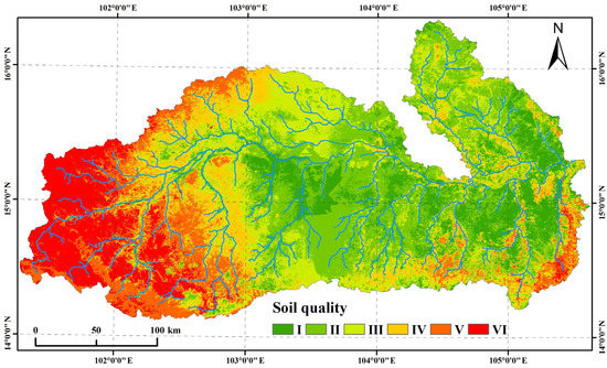 The indicator weight was obtained based on the communality of each indicator generated in the MDS construction process, and the soil-quality assessment result was generated through integrated weighting method (Table 4). The result was divided into six grades (I–VI) according to the natural breakpoint method, where the ranges were ≤0.49, 0.49–0.56, 0.56–0.65, 0.65–0.76, 0.76–0.88 and ≥0.88, and grade VI represented the best soil quality. The result is shown in Figure 5.