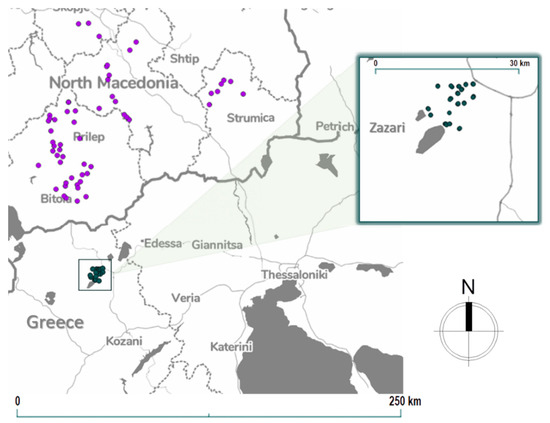Spatial distribution of soil samples along the MKD and Zazari region (Greece).