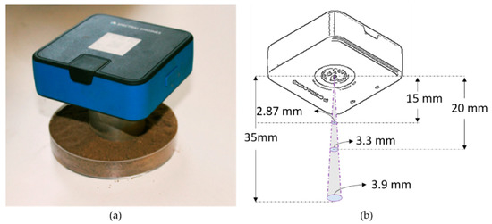 Considering the lack of an established protocol for measuring soil samples with the MEMS sensor, ten different scenarios regarding the sensor’s configuration were evaluated. Each scenario was conceptualized to test different instrumentation set-ups in order to select the optimal configuration. The adjusting parameters that were tested include the sensor’s distance from the sensed surface and the device’s light intensity. The device’s aperture angle is 7° while the sensor’s distance from its protective glass is 12 mm, resulting in a circular sensing area of 1.43 mm diameter that does not cover the minimum soil particle size limit of 2 mm of coarse sand [48]. By that means, robust and representative measurements could be questionable when it comes to non-homogeneous materials such as soil samples. Under that consideration, a mounting bracket that would raise the device from the sensing area and functionally expand the sensor’s field of view to a circular area over 2 mm diameter was tested. Three cylinders at heights (H) of 15, 20, and 35 mm with interior surface of maximum reflectance were evaluated. The tested tubes increased the sensor’s sensing area’s diameter, resulting to diameters of 2.87, 3.3, and 3.9 mm, respectively. For each tube, the measurement was performed over three scenarios connected to Light Intensity (LI), which was set to 80%, 90%, and 100%, respectively. The experimental set up of the MEMS sensor along with the differences of the sensed area alterations according to height changes is shown in Figure 3.