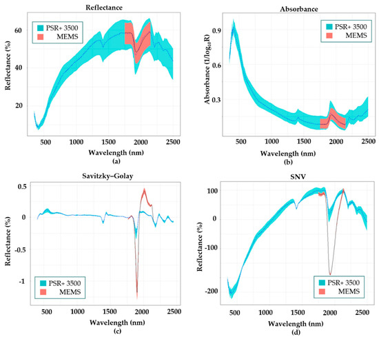 (a) Median reflectance measurements of complete dataset with PSR+ 3500 (with blue) and MEMS (red) ranging from first to third quartile. (b) Absorbance transformation. (c) First derivative transformation combined to third degree polynomial fitting. (d) Standard Normal Variates normalization.