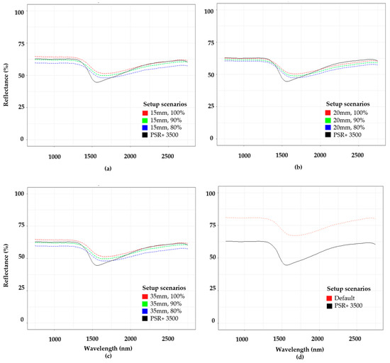 Median reflectance of subset dataset soil samples over ten different scenarios. A black solid line in each figure denotes the PSR+ 3500 median reflectance values. (a) Reflectance percentage for 15 mm height and three different light intensities. (b) Reflectance values with 20 mm distance from soil sample to MEMS sensor device and the three tested light intensities. (c) Reflectance values for 35 mm height from soil sample and the three tested light intensities. (d) Default setup (proximal sensed samples with 100% light intensity).
