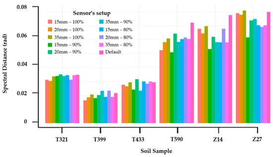 To quantitatively assess the spectral similarity of the spectra produced from the MEMS sensor against the PSR+ 3500 reference measurements, the Spectral Angle Mapper was utilized. The results with the setup of 20 mm height and 100% light intensity showed the highest similarity to PSR+ 3500 measurements, compared to the rest scenarios, in terms of minimum Spectral Angle Mapper distance, as shown in Figure 6. The default setup (proximal) that implies 100% LI and zero distance between the sensor and the sample, which is suggested from the manufacturer, presented the least optimal sensor configuration, with an average spectral distance of 0.052 rad. These findings demonstrate that field of view plays an important role on the sensor’s accuracy and verified the initial hypothesis indicating that in order to cover the minimum soil particle size limit, the sensor’s field of view must be increased. This was achieved through the increase of distance between the soil sample and the device. The other nine evaluated scenarios presented more accurate measurements in comparison to the default. More specifically, the order from the less accurate scenario to the most accurate is shown in Table 2. To that end, the complete dataset was measured in respect of the insights derived from the preliminary spectral analysis, setting the light intensity to 100% and using the cylinder of 20 mm height.