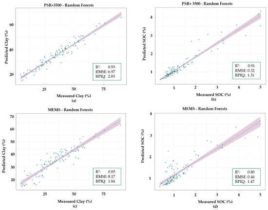 The calibration models were generated from the use of the RF classifier and the PLSR statistical method, while the preprocessing methods included the transformation from absorbance to reflectance, the Savitzky–Golay first derivative, and the SNV transformation, which were all applied in both calibration models. The results of the full dataset with LOOCV presented higher metric values with the use of the PSR+ 3500 sensor and the RF algorithm with R2 = 0.93 and RMSE = 6.97% for clay content and R2= 0.91 and RMSE = 0.32% for SOC content (Table 3). The PLSR showed less accuracy, supporting the hypothesis that it is more efficient in predicting linear relationships. However, in the case of soil analysis, the relationship between soil properties and spectral data are usually presented as nonlinear [60], and this can explain the low predictive performance of PLSR. In contrast, RF could describe complex linear and nonlinear relationships and interactions while it reduces the probability of model overfitting. High accuracy for clay content prediction was also reported by Waiser et al. [28] and [61], with R2 ranging from 0.85–0.88 values. However, the results are in contrast with the studies of [13,62], who reported better prediction models with the use of PLSR for clay content rather than SOC. In a study using 1534 legacy soil samples from Brazil, Ref. [63] noted that PLSR and RF models had similar predictive accuracies, however inferior to this study. This could be attributed to the local character of the present study and the smaller number of soil samples. Regarding SOC predictions, the results are similar to [14,56], who reported better results for the RF approach against the PLSR. However, Ref. [64] found that PLSR outperformed the use of RF, which highlights that differences between studies regarding the size of the dataset, and the range of the values of the modelled properties could significantly alter the accuracy of prediction. The respective scatter plots are shown in Figure 7.