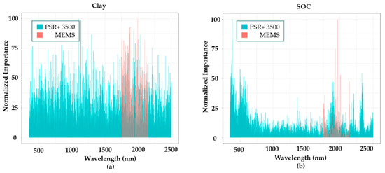 Normalized variable importance scores for each wavelength based on RF modeling. (a) Clay; (b) SOC.