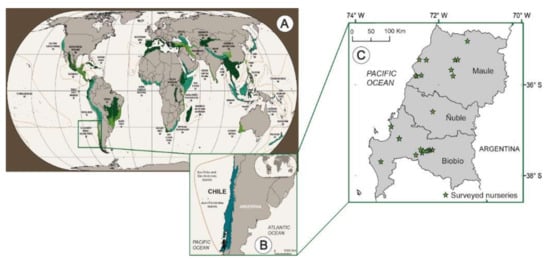 Figure 1. Global hotspots of biodiversity ((A); modified from []) including the Valdivian Forests of Chile (B) where the Maule, Ñuble, and Biobío regions occur (C). These three regions account for 78% of the national plant production. Green stars indicate locations of surveyed nurseries (C).