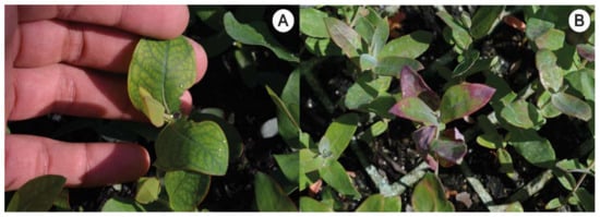 Figure 2. Deficiency symptoms of magnesium in Eucalyptus nitens (A) and phosphorus in Eucalyptus globulus (B) detected during the 2014–2015 growing season at nurseries in the Biobío region.