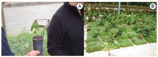 Figure 3. (A) Incidence on Botrytis cinerea on Eucalyptus globulus plants; (B) moss growth on the speedling surface due to excessive irrigation.