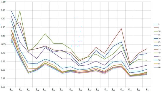 The lines representing the values of Ɛ in models with 4, 5, 10 and 15 observations (four top trend lines in Figure 2) diverge from the lines plotted for models with 25 to 60 observations (bottom lines in Figure 2). The shape of the line denoting the model with 20 observations is similar to the line representing models with 25 to 60 observations. These results indicate that for 17 evaluated attributes, the Grey Relational Analysis supports the generation of a stable model—a sequence of the values of the similarity coefficient Ɛ denoting the strength of relationships for 25 observations.