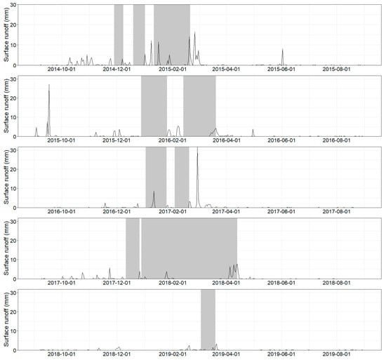 Surface runoff was mainly measured during winter months (January–February) and in early spring (March and April), usually coupled with snowmelt (Figure 2). Compared to the normal period (1981–2010), temperatures were higher in February-March in the study period in all years except for 2017/2018, which contributes to increased runoff during these months (Table 4). The highest average monthly surface runoff (59 mm) occurred in February 2015, due to snowmelt and rain. At that time, the soil was partly frozen. In January 2015, high surface runoff (45 mm) occurred due to rain on frozen snow-covered soil. A reduction in infiltration capacity due to frost led to higher amounts of surface runoff in both cases. Stability of snow cover varied between years, with the least stable winter in 2014/2015 and most stable in winter 2018/2019 (Figure 1).