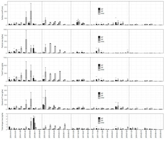 In 2015/2016, surface runoff was the main source of soil loss on the winter wheat plots. Moreover, the surface runoff occurred mainly in autumn and winter that year (Figure 2). Frozen soil reduced infiltration from January to April 2016, which also led to higher losses in surface runoff compared to subsurface runoff.