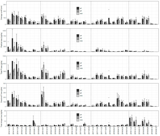 Due to the close relationship between loss of soil particles and total phosphorus, the effects of weather conditions during winter as described for soil particles are also applicable to total phosphorus. Severe erosion and loss of total phosphorus occur during events with rain on frozen or snowcovered soil [11]. Hoffman et al. [31] showed that late winter snowmelt and mixed snowmelt and rain events increased total phosphorus losses and the DRP/TP ratios with a need to focus management actions on this period.