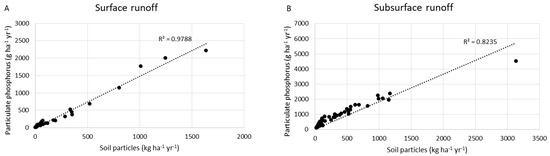 In surface runoff, there was a close link between losses of particulate phosphorus and losses of soil particles (PP = 0.0015 SS; R² = 0.98) and correspondingly for subsurface runoff (PP = 0.0018 SS; R² = 0.82) (Figure 4). According to these relationships, the content of particulate phosphorus in soil particles in surface runoff was 1.5 g P kg−1 soil and in subsurface runoff 1.8 g P kg−1, which is higher than the measured content of total phosphorus in soil (0.9–1.3 mg P kg−1; Table 1). This indicates an enrichment of phosphorus in both surface and subsurface runoff [29].