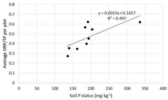 Average dissolved reactive phosphorus (DRP)/total phosphorus (TP) in surface runoff all years per plot in relation to soil P status (mg P-AL kg−1).