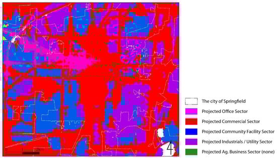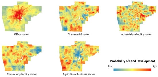 In total, 26,794,334 cells were compared, resulting in a sectoral classification of the economic growth probability (Figure 2). The amount of land development (i.e., the number of estimated newly developed land cells) for each sector was computed using the spatial employment densities from REIM (see Table 1). Development locations were selected according to probability values with some stochasticity built into the algorithm to represent urban development uncertainties.