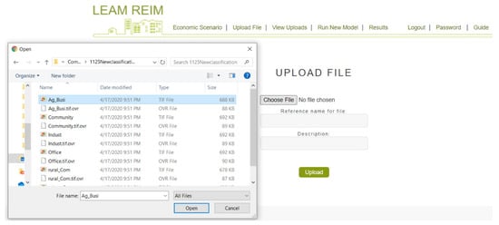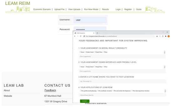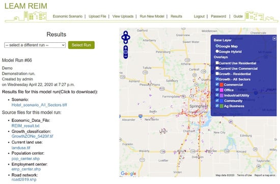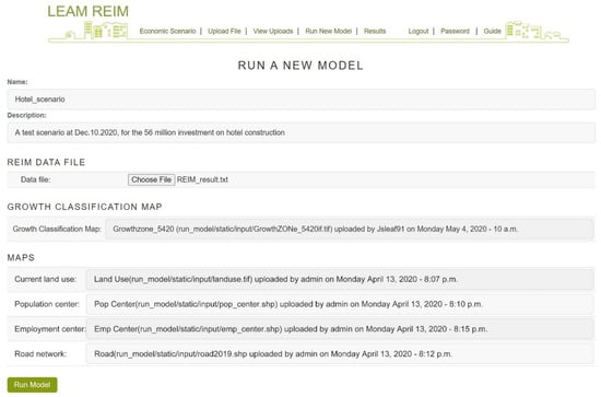 Our PSS user interface seeks to simplify the complex data analysis progress for non-technical users, provide interactive visualization of data, and collect user real-time feedback. Figure 3, Figure 4, Figure 5, Figure 6 and Figure 10 show the LEAM-REIM PSS web interface. Figure 3 describes the interface component that allows users to upload and annotate model input data. All uploaded files are stored in a web database and can be viewed in the “View Uploads” page. Figure 6 displays the interface component where users test, run, and download REIM scenarios. This provides estimations of future employment, based on user input (in dollars) for one or more industries. The estimated results of future full-time employment in 2040 for a baseline and investment scenario are shown for comparison. The table generated (Figure 6) is downloadable as a txt file and is used for LEAM input. Figure 4 presents the procedure for selecting the uploaded data, designing a scenario, and running a typical LEAM scenario. LEAM model inputs include the REIM scenario result, current land use, population, employment, road network, POI, and growth classification maps. Growth classification is a raster map with values ranging from 0 to 5 representing potential growth restrictions (or incentives). For example, state or nationally controlled lands (military bases) would be classified as a 0—no growth zones. Tax increment financed (TIF) districts and other enterprise zones would have a more aggressive classification. Growth classification are determined by the user (in this case the Sangamon County Regional Planning Committee) according to the local natural restrictions (e.g., flood zone, watershed, green infrastructure preservation), historical restriction (historical district preservation), and zoning. Figure 10 shows the interface component (google maps API) for visualizing the land use change estimation result based on the built scenario. Users are also able to adjust the visualization to compare the estimated land use changes with the current land use map and download the attached model inputs and results. Previous model results are also available from the “select a different run” drop list. The scenario name, description, and inputs are attached to each scenario for bookkeeping and scenario comparison. Figure 5 shows the web page for collecting user feedback on model algorithms, model application, and interface design through an online survey.