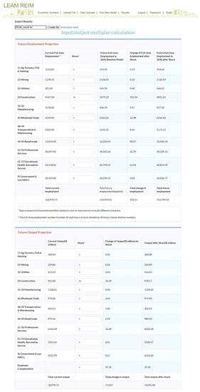 LEAM-REIM interface showing REIM result of the investment plan which invested 56 million dollars in construction. The investment is described as “Shock” values for each industry type for the current year (in millions of dollars). “Future Full-time Employment in 2040 in baseline model” shows the estimated employment in 2040 if without any investment. “Future Full-time Employment in 2040 after shock” shows the estimated employment in 2040 considering the investment scenario.