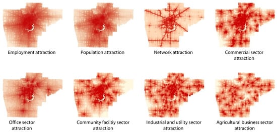 LEAM produced attraction maps, (e.g., population, employment, places of interest (POI), and transportation) to generate probability maps (where development is most likely to occur) for each individual economic sector. Each attraction map was computed using a Stochastic Greedy Algorithm which accounts for network-based accessibility in terms of travel time, so that network congestion can be considered []. Each resulting map represents the likely locations of land development for each economic sector in response to economic growth in the study region.