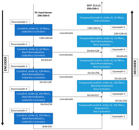 In the decoder, we used transposed convolutions (with a stride of 2) to upsample and resize the output to the input’s dimensions. As a means to avoid overfitting, we applied a dropout operation with the rate of 0.5 between the encoder and decoder. Similarly to U-Net [9], skip connections were added between the encoder and decoder parts, to avoid the loss of low-level information and enable the share of information between different stages across the network. Details about the generator architecture can be found in Figure 3.