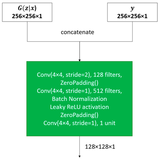 Second, ’s inputs are and concatenated in a tensor (), which should be classified as fake, and the conditional information concatenated to the target image , which should be classified as real. When a pixel comes from the target domain (real sample), the true label is 1, whereas when a patch is fake, the true label of the pixels will be 0. The final layer of is a sigmoid function, with ’s cost function being a sum of the cross-entropy between the ’s prediction and the actual labels for these two inputs (array of zeros in the case the fake images, and array of ones in the case of the real images).