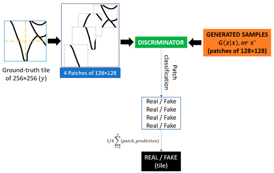 operates convolutionally over the 256 × 256 tile and is capable of classifying larger image patches (128 × 128, instead of 32 × 32) to decide if the input is real or fake. The discriminator takes four patches of 128×128 as input and classifies from which distribution the input comes from (real or fake). The decision scores are averaged to obtain a final prediction for the input tile (as seen in Figure 5).