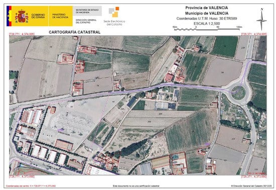 - Berné Valero, J.L.; Femenia-Ribera, C.; Benítez Aguado, E. Catastro en España; Universitat Politècnica de València: Valencia, Spain, 2008; ISBN 978-84-8363-242-0. [Google Scholar]