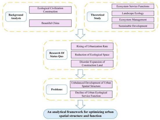 Urban spatial structure refers to the spatial distribution of urban elements and the interaction and formation mechanism of these elements [1]. From the perspective of three-dimensional space, urban spatial structure can be divided into horizontal and vertical structures [2,3]. Horizontal structure is usually characterised by the composition and spatial pattern of land-use types [4,5], while vertical structure is characterised by building and vegetation heights [6,7]. Urban function refers to the capability of urban space and its respective functional zoning [8]. In general, urban areas have production, living and ecological functions in any region [9,10,11]. Among these, the ecological function is foundational, providing support for human production and living. The coordinated development of urban spatial structure and function can promote sustainable urban development. Since 1978, China’s urbanisation has profoundly influenced its urban spatial structure at an astonishing speed [12]. Under the background of ecological land occupation by development activities, ecological space is continually crowded out, and urban ecosystem service functions face severe tests and challenges. Moreover, China’s urbanisation rate is continuously increasing, with predicted rates of 60% and 75% by 2020 and 2035, respectively [13]. Rapid urbanisation further aggravates the serious contradiction and conflict between the various functions of urban space. As a result, the impact of urbanisation has attracted a great deal of attention, which has proposed an imbalance in urban spatial structure and a decline in urban ecological functions, including reductions in carbon storage, biodiversity and cropland [14,15,16,17]. Therefore, against the new background of promoting ecological civil construction and building a beautiful China, exploring the collaborative optimisation of urban spatial structure and function is conducive to trading off the relationships between ecological protection and economic development, as well as construction and non-construction during rapid urbanisation. This has turned into an important topic concerning regional sustainable development. Through a literature review, we established a theoretical framework, as shown in Figure 1.