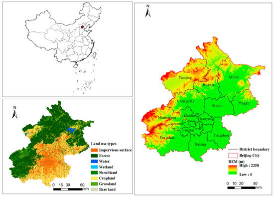 As the capital of China, Beijing (39°26′–41°03′ N, 115°25′–117°30′ E) is located on the northwest edge of the North China Plain The total area is approximately 16,400 km2. Mountains surround Beijing on three sides, and the elevation of the region decreases from the northwest to the southeast, with altitudes ranging from 2258 m to 6 m (Figure 2). Beijing has a warm temperate continental monsoon climate, and its annual precipitation ranges from 600 mm to 700 mm on average. There are 16 municipal districts in Beijing. As of 2019, 86.6% of Beijing’s population is from urban areas, comprising approximately 18.65 million people.
